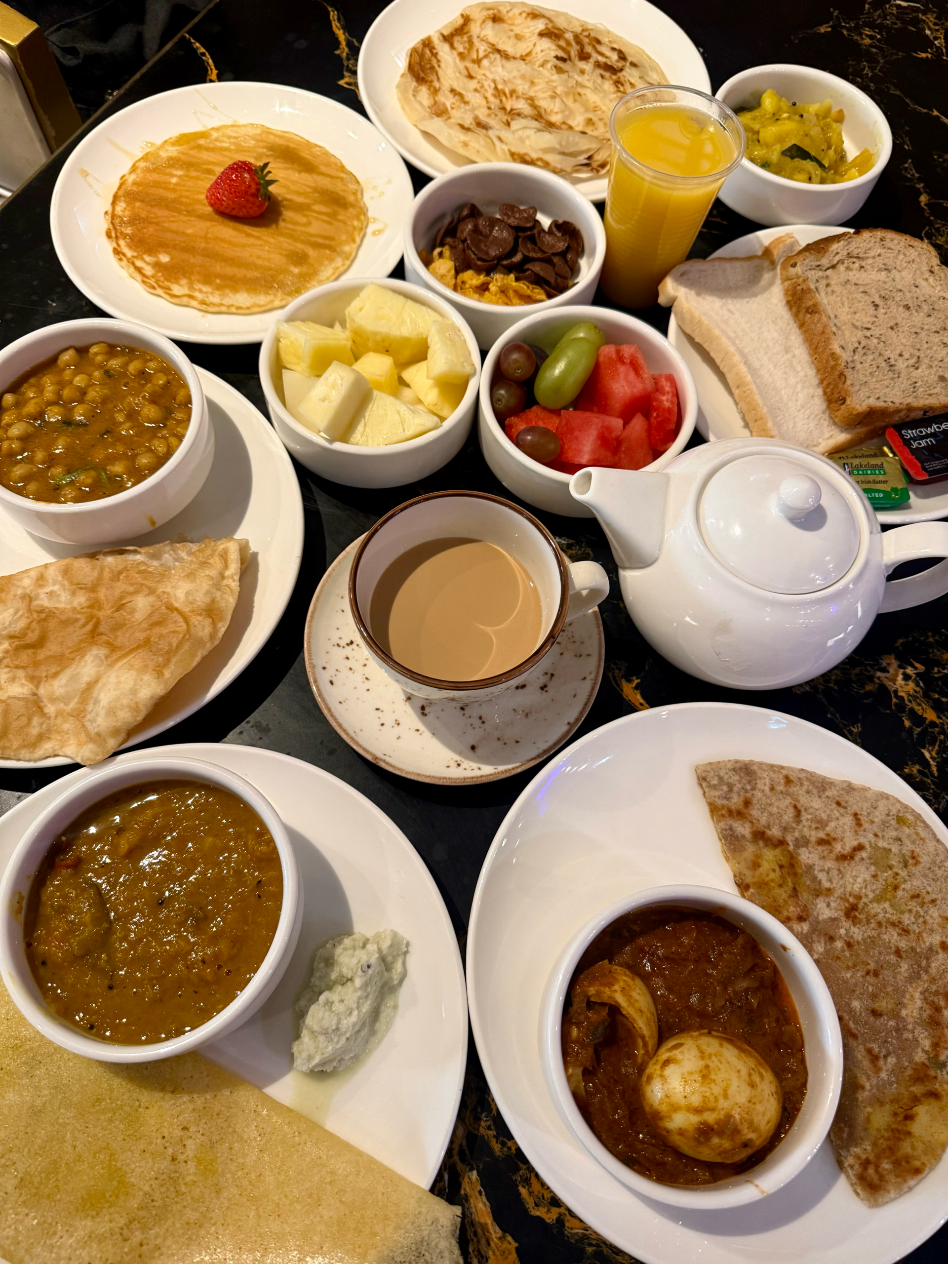 From comforting chai and fresh coffee to a mix of fruits, cereals, and juices, there’s something for everyone. On the hot side, expect classics like chole, aloo, puri, paratha, and even South Indian delights like live dosa. For those who want a global touch, they’ve got pancakes too!